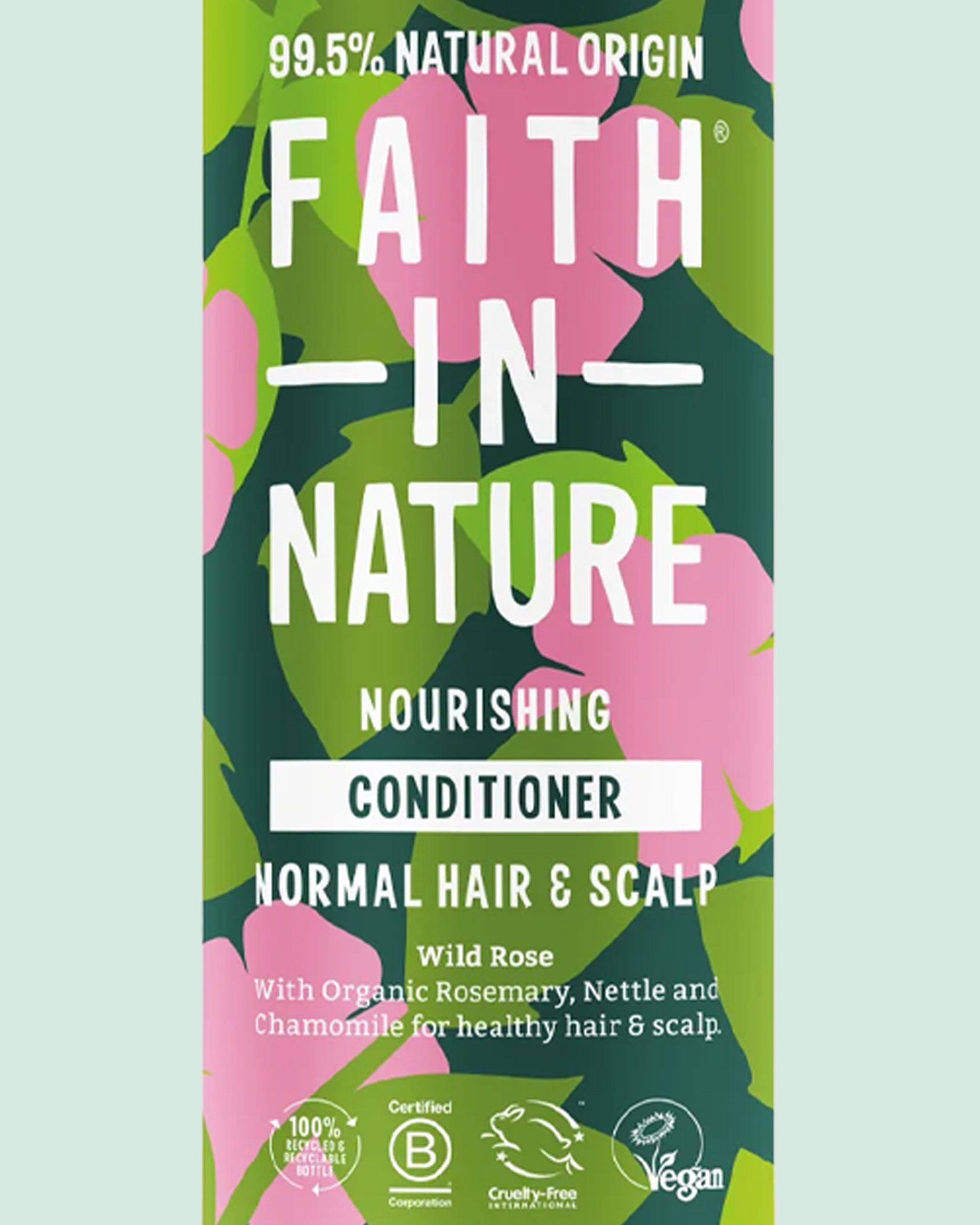Natürlicher, pflegender Conditioner, der das Haar nährt, revitalisiert und ihm mit dem beruhigenden Duft von Wildrose und Pflanzenextrakten Glanz verleiht.